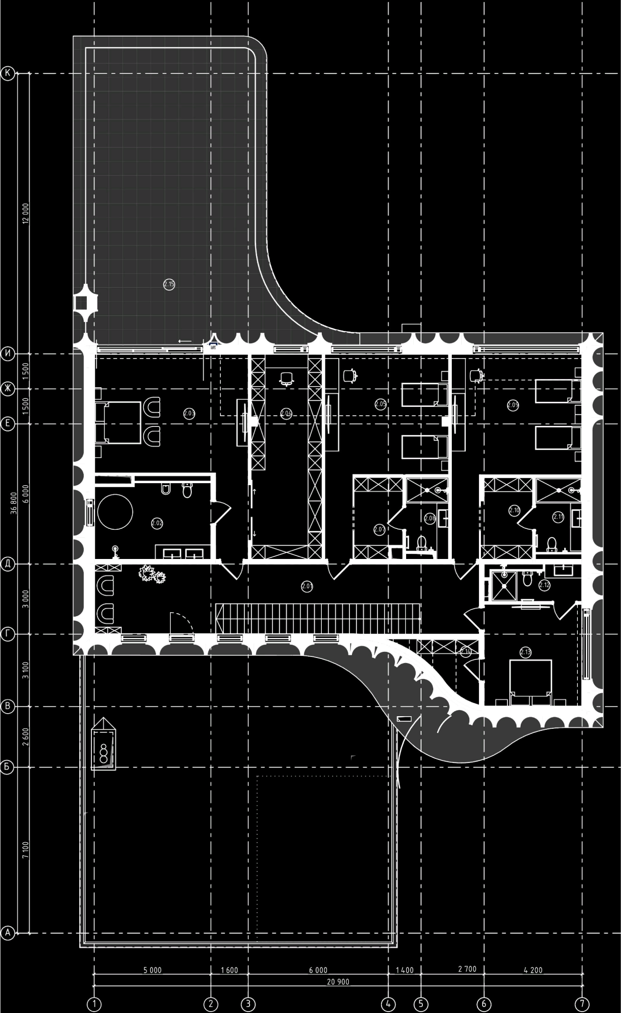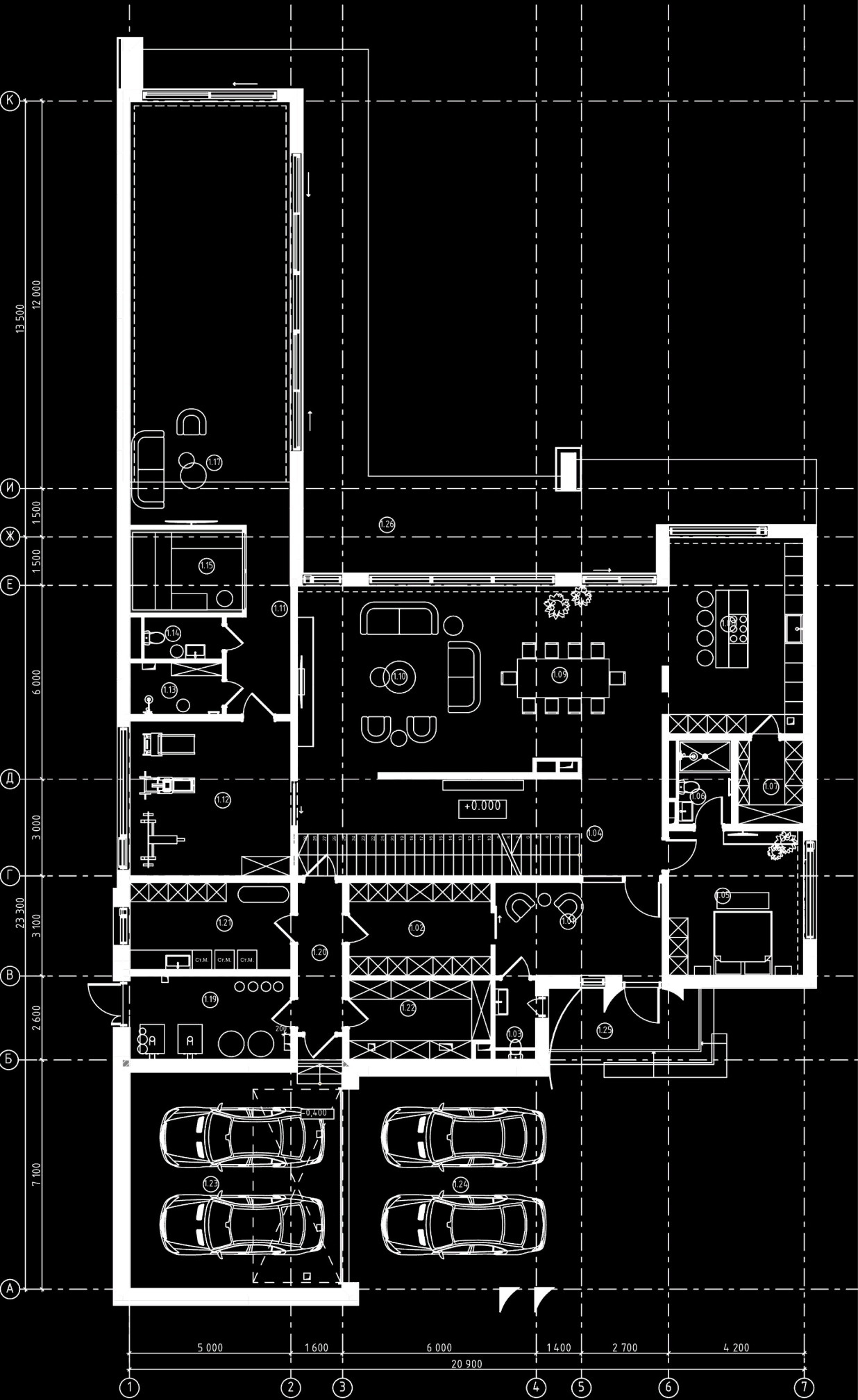 On the ground floor we managed to fit the rooms that are important for a comfortable and fulfilling life — in a single area there is a living room, a dining room, a kitchen, a swimming pool with a relaxation area, a sauna, a gym, a guest bedroom, as well as all the necessary technical rooms (dressing rooms, storerooms, laundry room, boiler room).